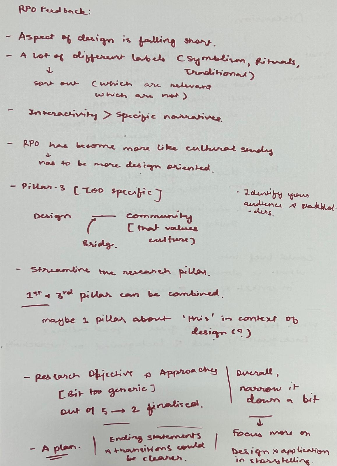 There were a lot of areas in my research and its presentation that needed work, starting with restructuring the three pillars. Although what is bothering me the most is the research objective, that I have not figured out yet. But the research seems to have taken a good turn. I feel like I am able to identify the depth of each pillar.