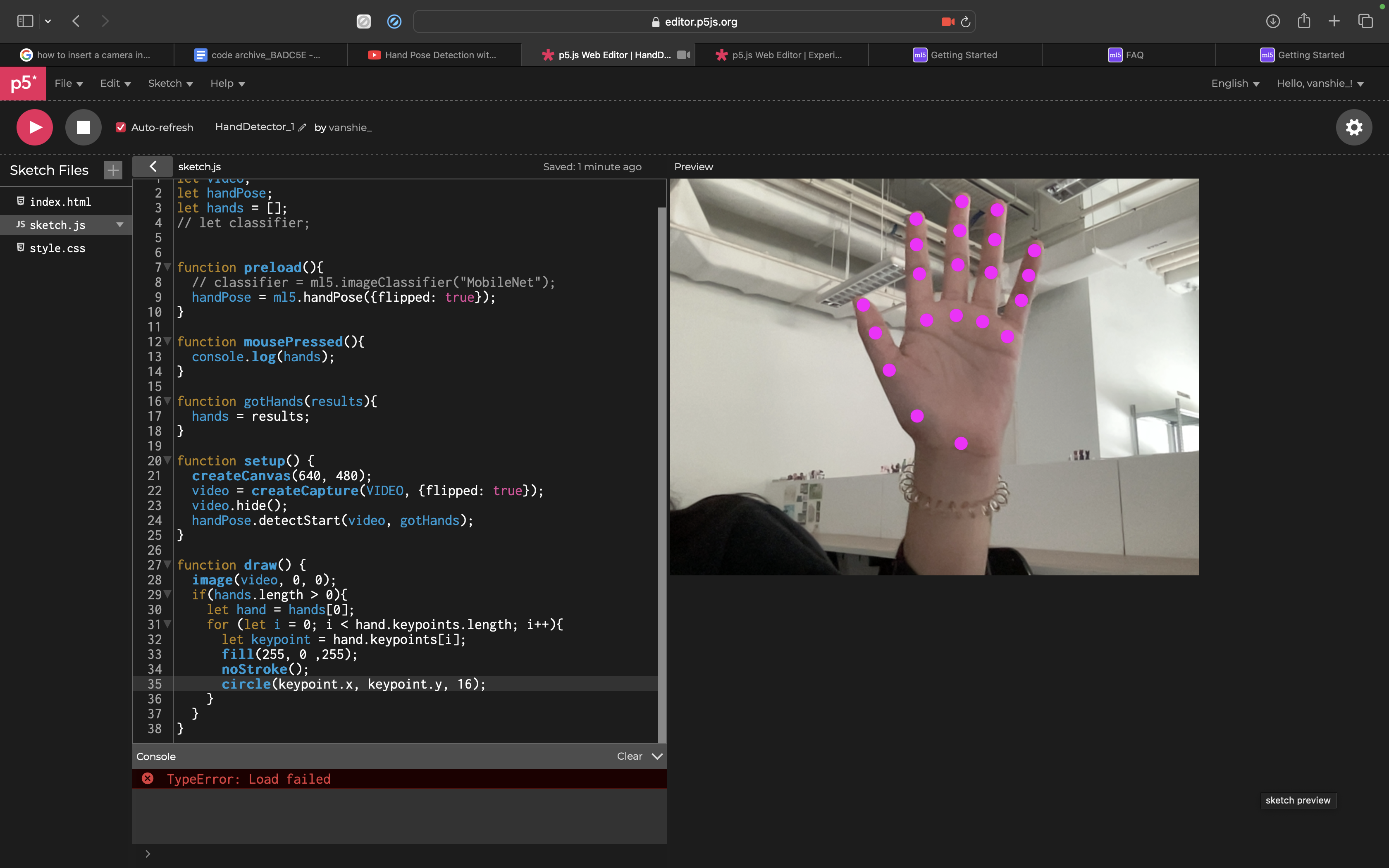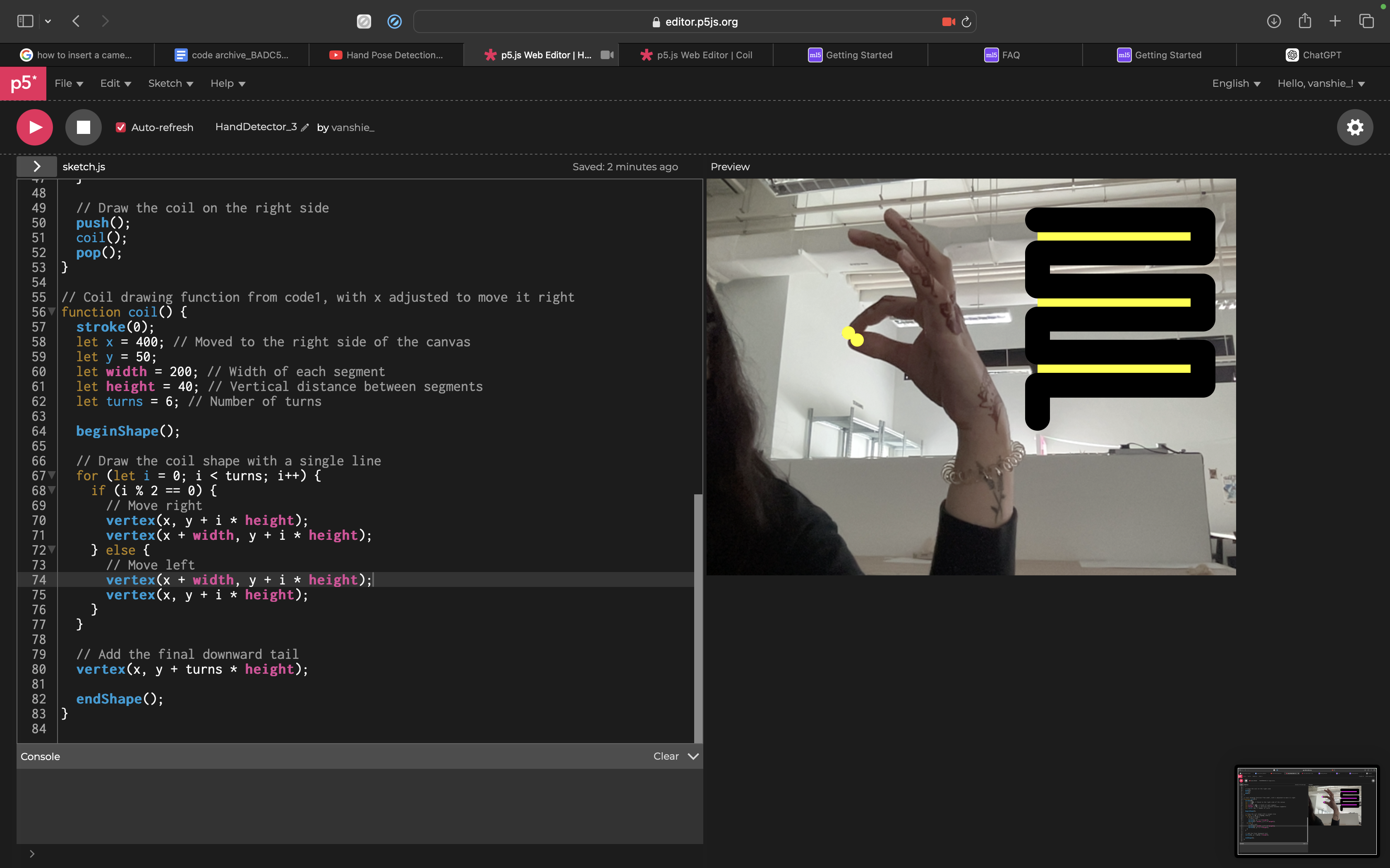 First I learned how to enable hand detection via this tutorial. I wanted p5 to detect the index finger tip and thumb tip and once I did that I got chatGPT to incorporate into my experiment sketch.