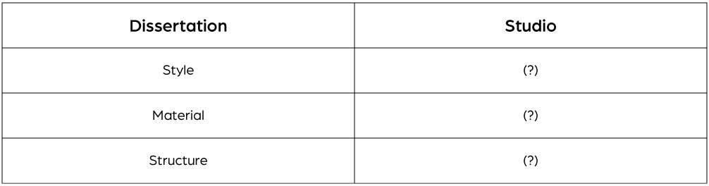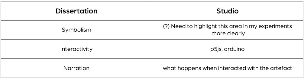 The ones marked (?) are the things that are missing in the studio work. The point of making the tables is to think about the connection between my dissertation and studio. To get the style, material and structure of my artefacts, the first thing I need to do is figure out the narratives. Second, highlight how is symbolism reflected in my outcomes? Third, to make a storyboard for options of where these experiments could direct towards. Improvements - I need to improve in the way I present my ideas, progress and outcomes.