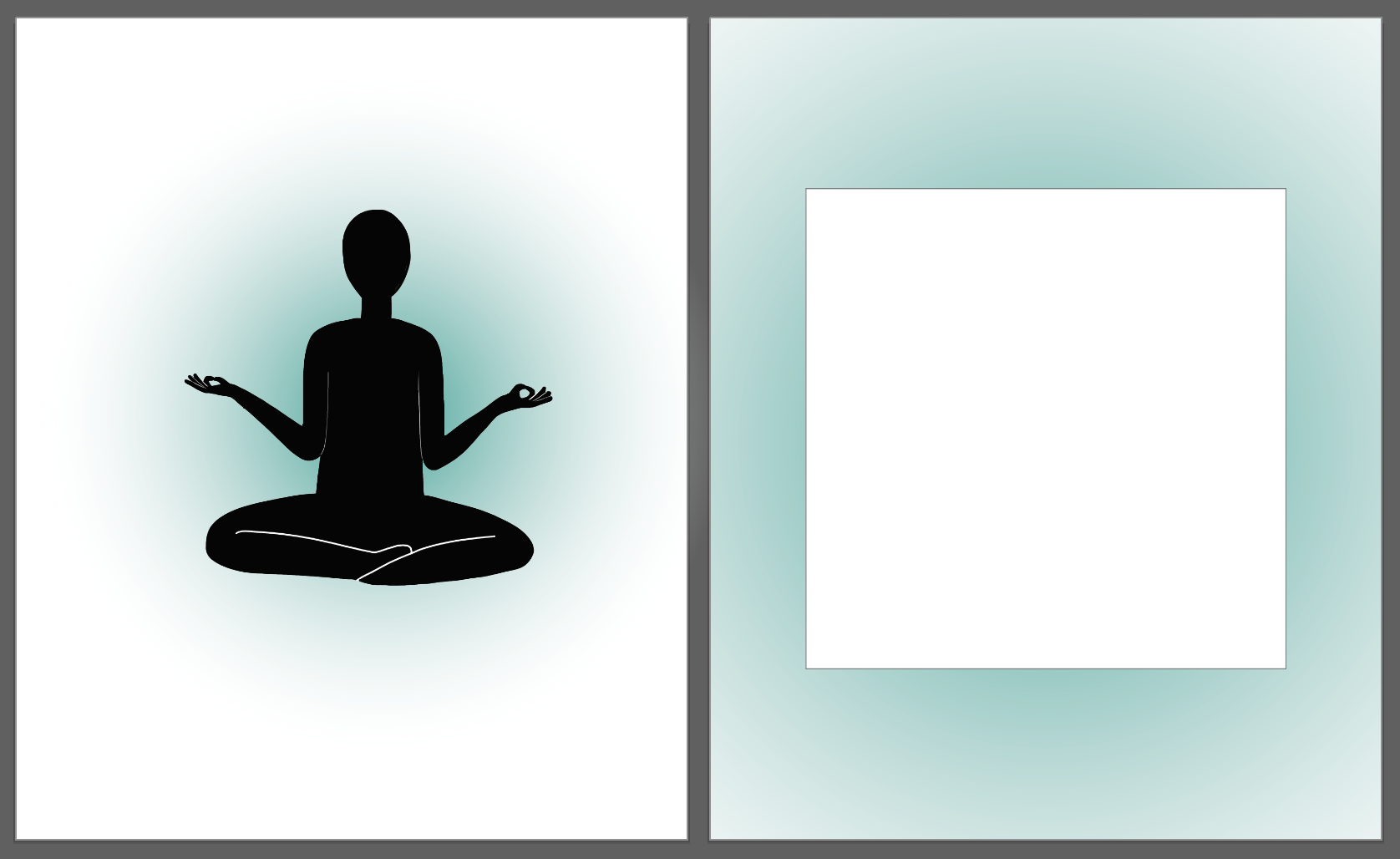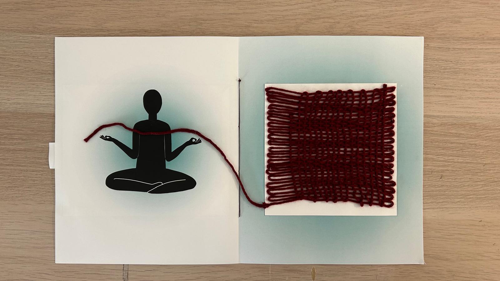 For the second page I had to portray someone meditating and the page next to it would have strings placed together looking like a cloth. One string from that, would reach out to the silhouette of a person meditating to show that he is doing something to the blanket.