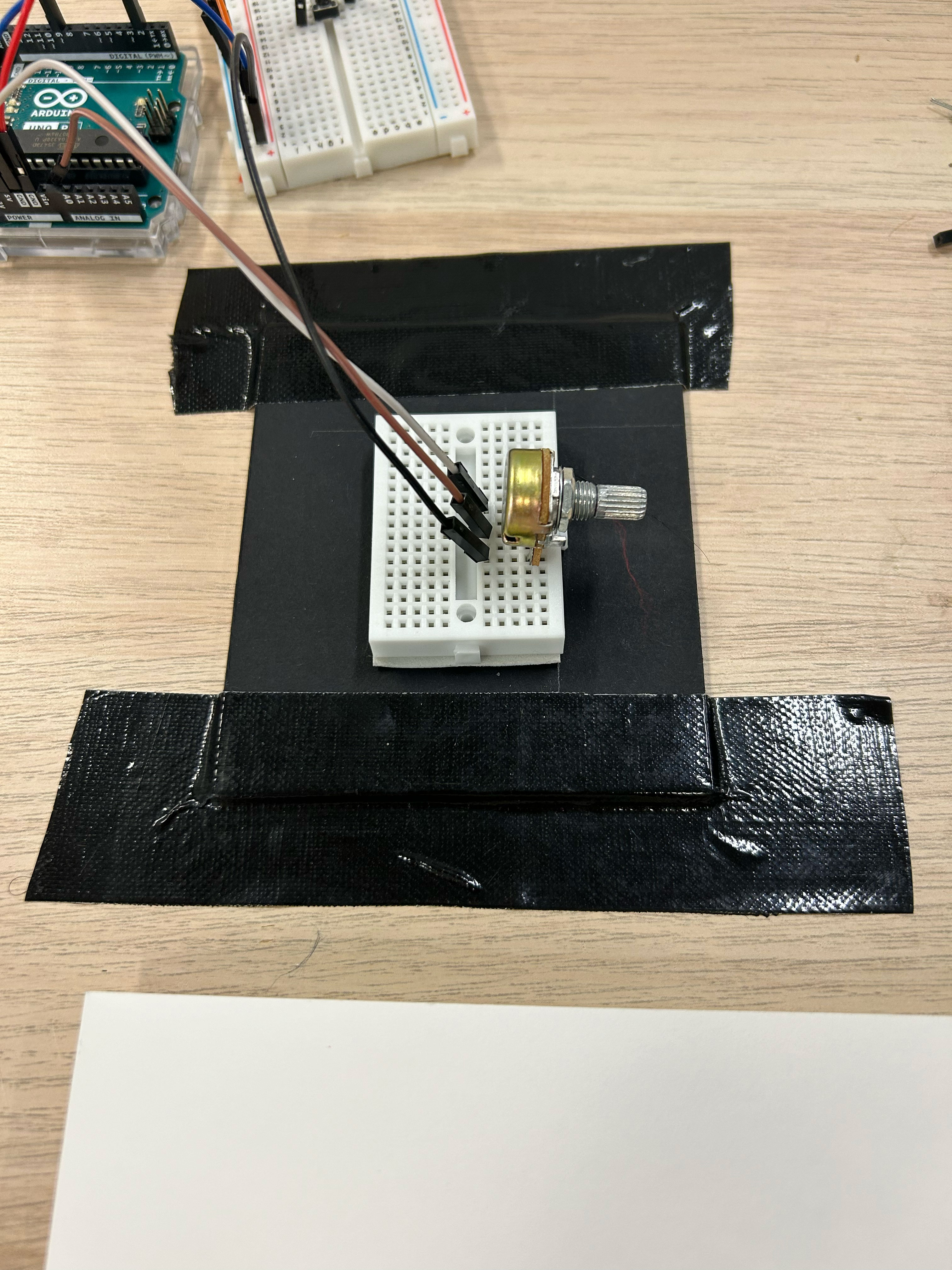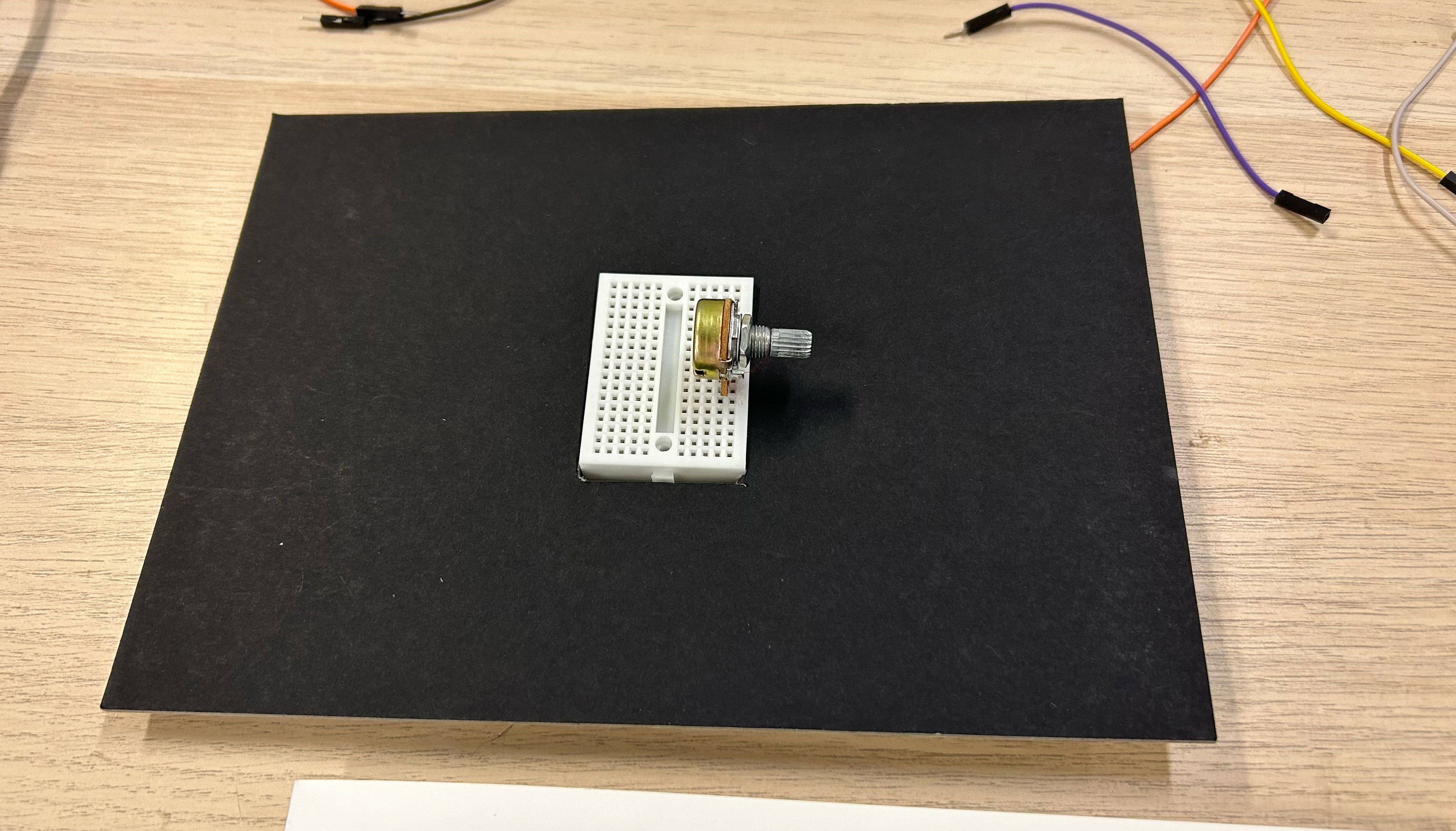 I put an extra device on the table thinking it could offer a more comfortable view but it ended up causing confusions. I had also stuck the mini-bread board holding the potentiometer on a black art-card and then put another paper above to cover the taped area. I wanted the set-up to look clean.