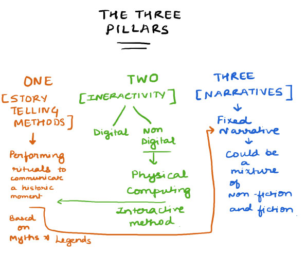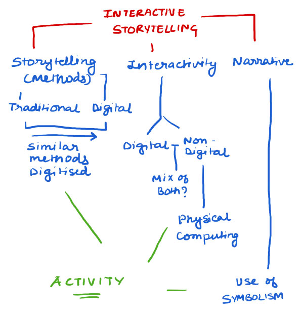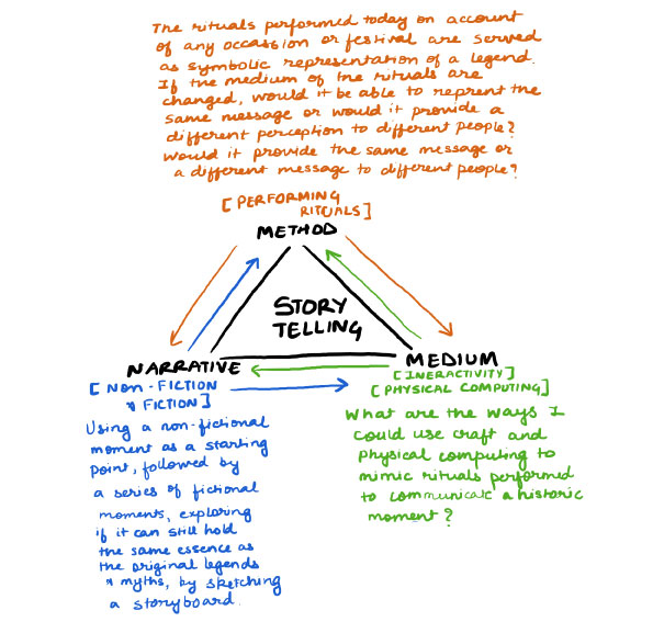 I haven’t researched further however this mind map contains my current state of research questions according to each pillar or would I say further points of exploration to each pillar. I plan on doing another activity. Previously I conducted an activity that had its focus on interactivity. Now I plan on exploring an activity based on Narrative, storyboard a narrative, starting with a non-fictional moment and just naturally sketch and see how I unfold a narrative and to what. Which also brings another question to my mind: “Some of the practices involved in the legend are based on beliefs of the time, will the beliefs of current time influence the essence of the storyline?” - It may be a bit vague but I also want to explore how current beliefs influence the essence of the symbolic representations.