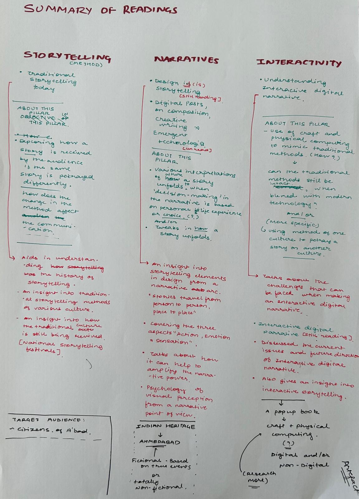 After reading ‘Traditional Storytelling Today’ - Margaret Read MacDonald, there were a lot of thoughts occurring in my mind, lot of new research points like the chapter I read from this book, was about how the digital age has caused a decline in traditional storytelling methods and how people to this day are trying to revive the culture of storytelling. It also gave me an insight into something known as the ‘National Storytelling Festival’ that first happened in 1973. Reading about it, I also realised that when the book talks about Traditional Storytelling, it is not focusing on writing and reading, it is rather focusing on the origin that is oral storytelling and live performances which is defined as ‘Traditional Storytelling’. I thought I would be able to go through a few chapters in a day but reading just one already got me to re-consider the activity that I had recently planned to do - to sketch through a narrative. Also at the same time I feel like I should look for similar projects but I also want to first go through the readings. I want to research ‘Different ways to build a narrative’. Or is it that I want to tweak an already existing narrative and communicate it differently? Or am I doing it again - using really big words which could be separate concepts?