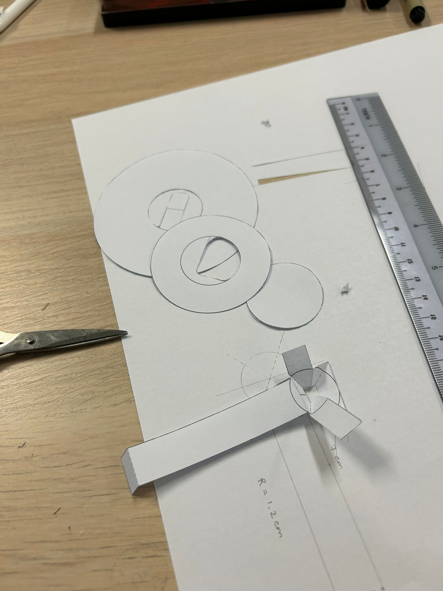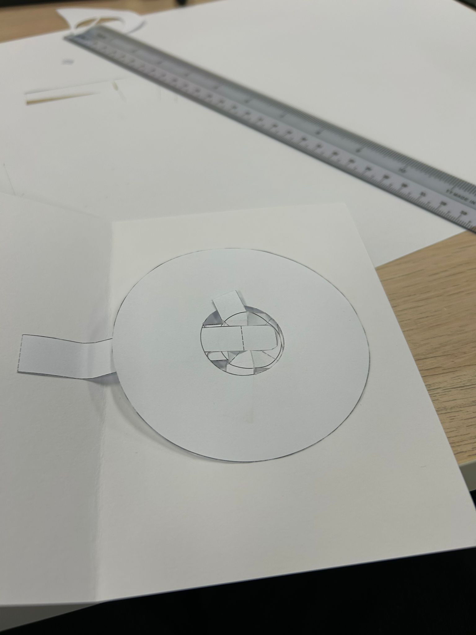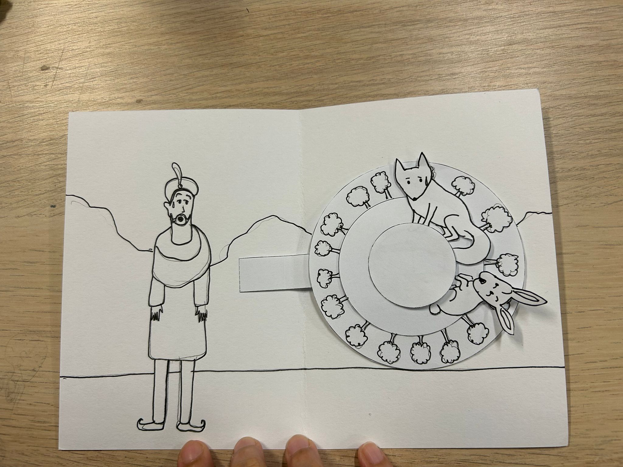 I actually first made all the necessary plan on illustrator and then pritned it and made cuts. The circles in this pop-up card would rotate, portraying the rabbit chasing the jackal.
