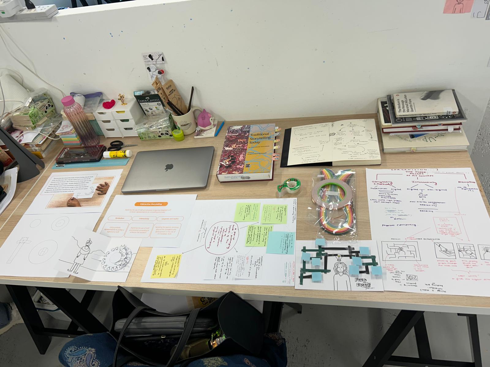 The set-up is not exactly great. I didn't have much content to put on the table so I curated my mind maps on the table as well, however it looks quite chaotic. As for the project development, in terms of concept there is good progress but my documentation and presentation could use a lot of work.