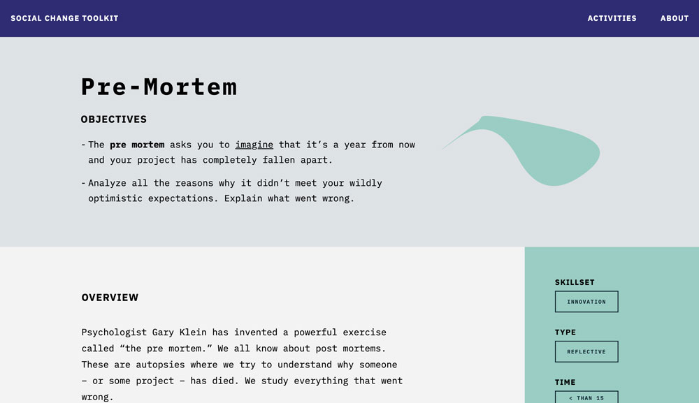 In the workshop slides we also came across an activity - pre-mortem . Basically we have to imagine that our project has fallen apart and analyse what could be the cause(es). Like after death there’s a post-mortem. I liked the idea of doing this activity as I believed it will also help me in analysing what steps I should take further.