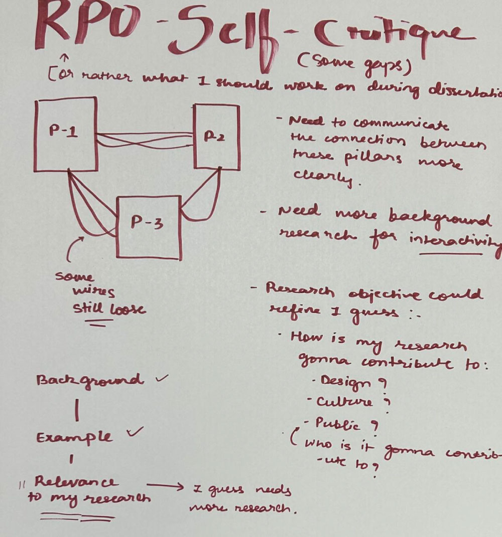 After the RPO I made a list of things that I thought were missing or could improve in my RPO. Or could be used as notes for dissertation. These were some things I observed while writing the RPO and after submitting it. As notes of what could be taken care of during dissertation. I also want to refer to more readings maybe because some of the areas in the research are still a bit unorganised in my thoughts, like the connection between each pillar. For now I thought I should also think about what I want to do for studio work. And I wanted to explore the arduino for which we have a workshop this wednesday, 9th October 2024.