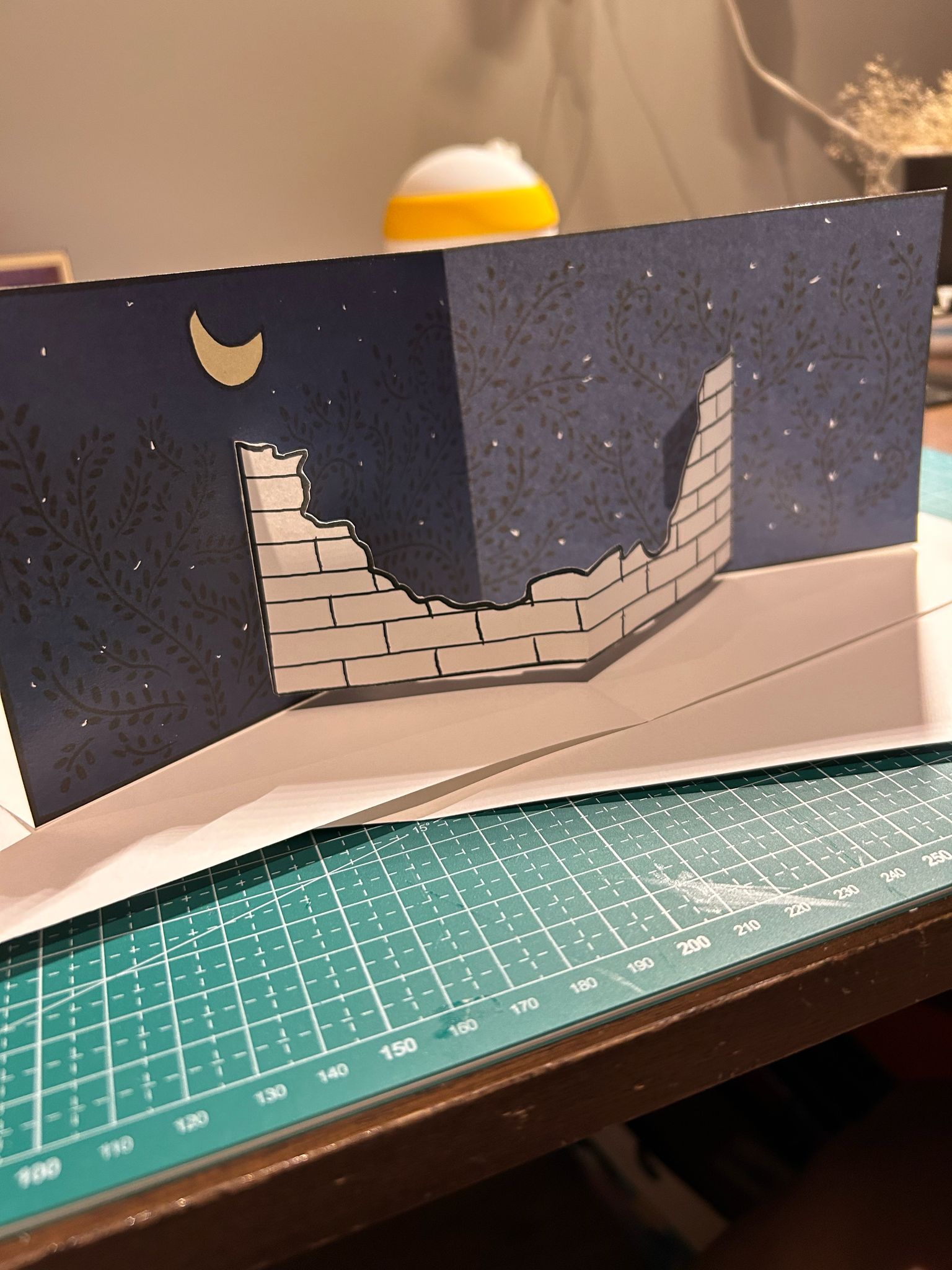 I was planning to make a tunnel book, but now it is starting to feel like I could make it quite complex and maybe I should start simple first. Following a youtube tutorial I made a simple pop-up that embodies the following part of the narrative: “the wall standing still during the day would suddenly fall apart at night”. While the pop-up was successful I feel like it would be more interesting to have a single spread where the wall falls apart (fig).