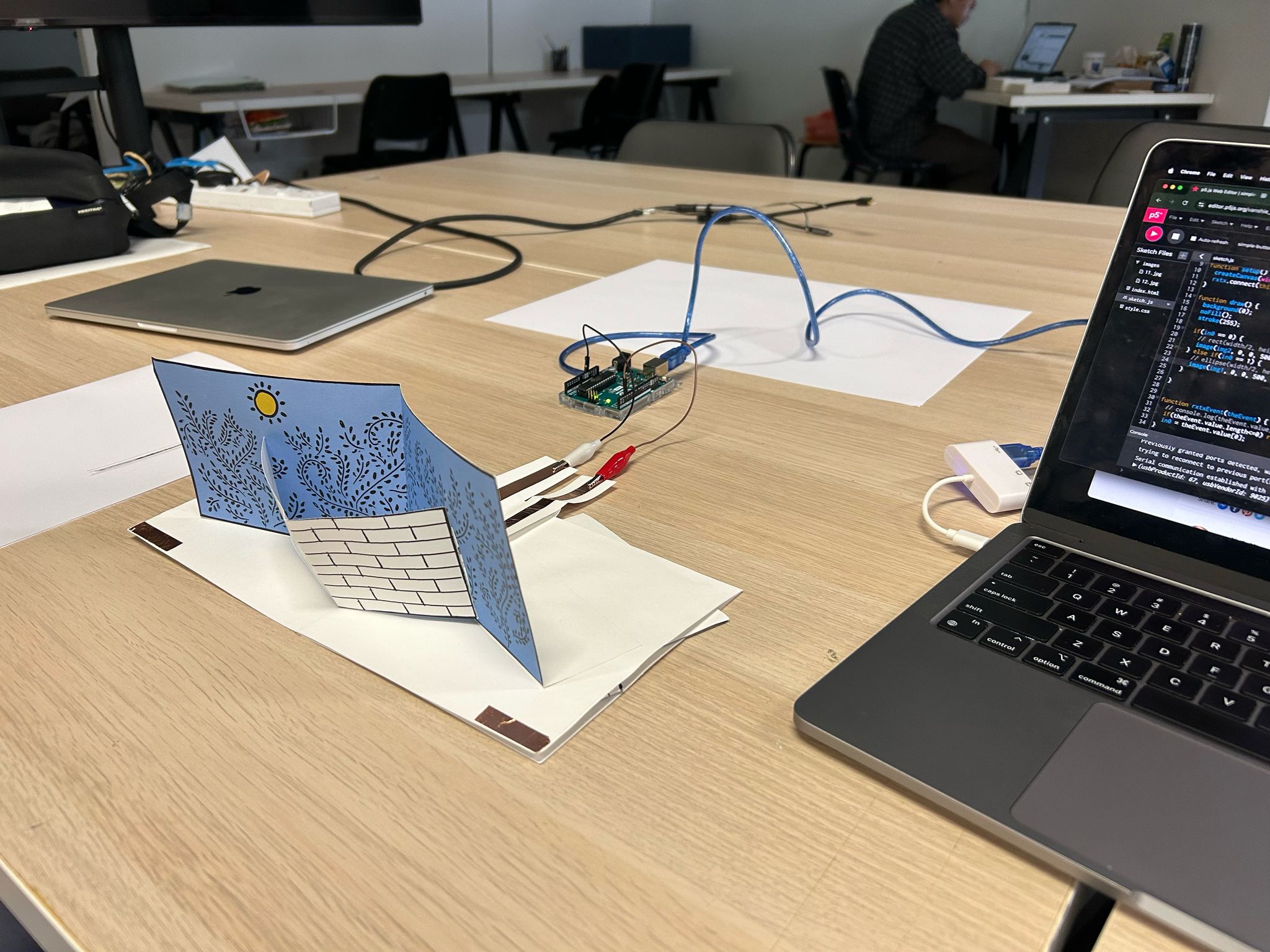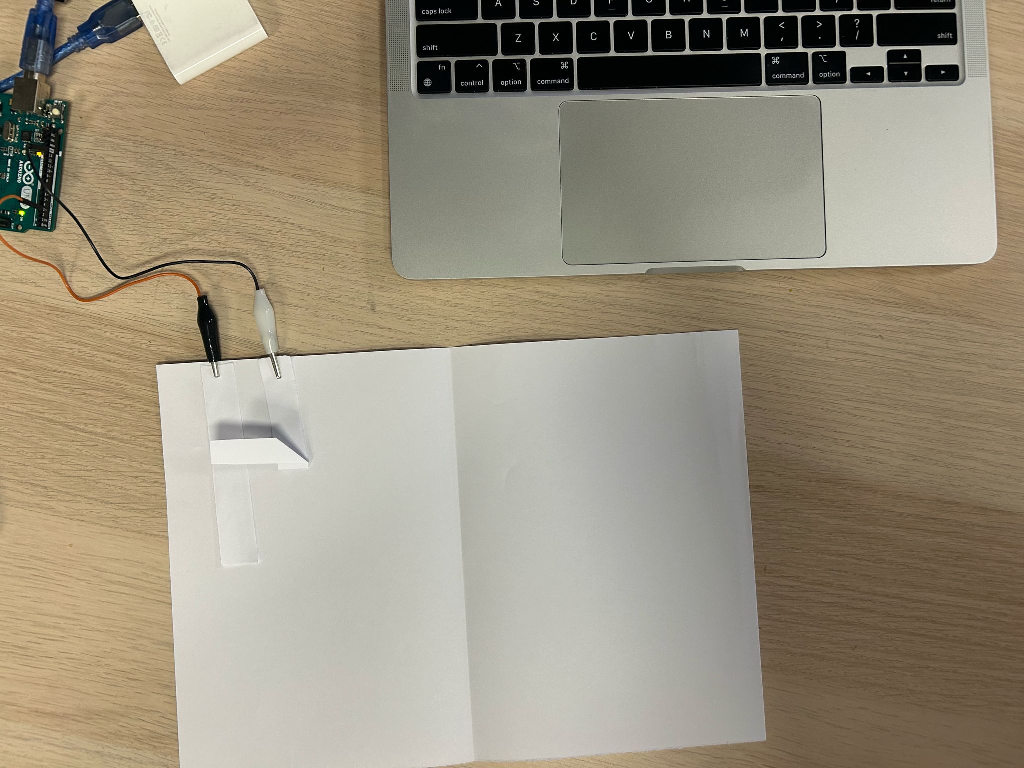 I was still a bit stuck on detecting a page-flip hence I tried to do so in this experiment. First I just put the copper-tape on the mock-up that I had made, however due to the pop-up, the page wouldn’t completely touch in order to trigger activity on screen (fig). I created a separate tool (tool A) to insert on the pop-up book (fig- diagram of the tool) and (fig). Due to the use of crocodile clips, the copper tape on the tool could not entirely touch each other hence the tool needed to be pressed. The tool could use an additional layer inserted, in order to have GND and input press against each other. This could ensure a smoother experience when the users are going through the book.