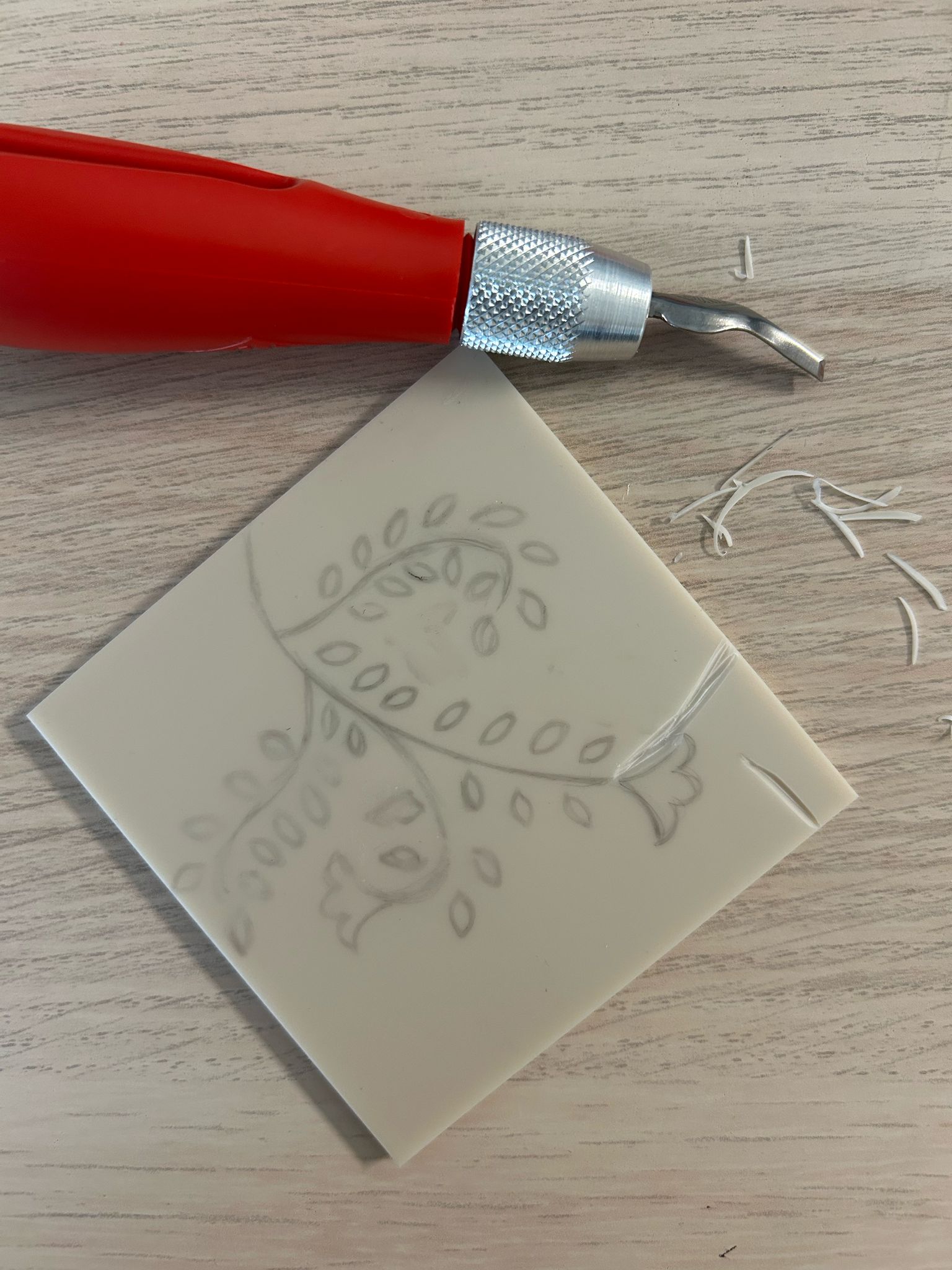 This week I also had a workshop led by Andri and Vincente for more perspective and guidance on the visual style. So far I was considering digital printing but last week Andreas had advised me to see if there is any way I could block print. Andri and Vincente mentioned that I could use lino-print for block-printing, that it doesn't necessarily have to be a wooden block that is traditionally used in block-printing. They showed me a couple of examples of lino printing as well and also suggested that I could also begin with using a blue-foam and try to see if I can find techniques that are faster. But I was quite intrigued with the idea of lino-printing so I decided to experiment with it next. So I simply started to experiment with the most repetitive visual in my storybook, that is - the trees. When I began carving, I sort of carved a bit too deep that it destroyed the lino. I realised that this is quite time consuming and I may have to give extra time to this but also realising that my storybook has a lot of repetitive visuals I decided to go ahead with lino-printing. (fig)